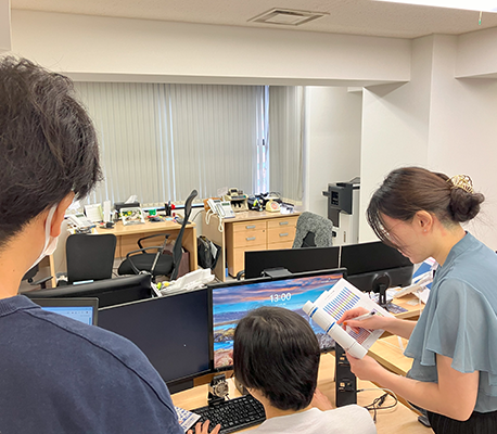 A:手探りの毎日ではありますが、いいデザインに対してクライアントや営業部からの「ありがとう」が私のモチベーションになっています。デザインのクオリティが数字に直結し、営業部とクライアントと同じ目標を持って制作ができる点は、魅力の一つです。